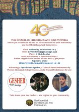 Join us at our 40th anniversary celebration and the launch of our journal, Gesher, celebrating four decades of walking together. The event will also include a cultural performance by students from the Worowa Aboriginal College and a musical performance by Lior. Tickets are $25 and include a kosher light supper and a copy of Gesher. To book, go to: https://events.humanitix.com/ccj-at-40